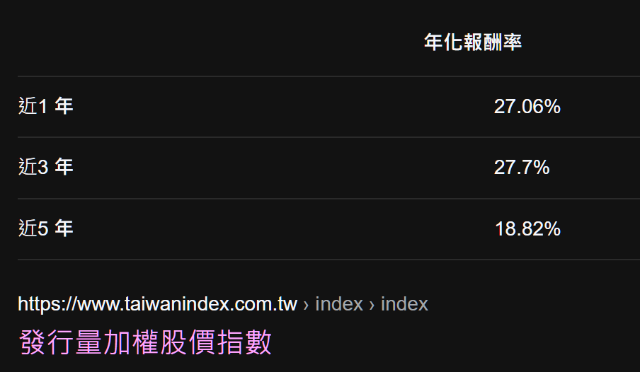 註:在查詢台灣加權指數時,最下方有一行小字「以上基金報酬率不包含配息」,這部份將會影響總報酬率,在未來的文章會再說明。