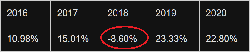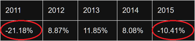 於是冷蛋往回查更以前的報酬率數據 (台灣加權指數*),發現原來有一年是負的!