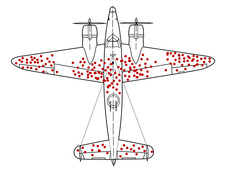 但這時專業的教授給出了完全相反的建議:「大家能看到彈孔聚集在這些地方,是因為這些飛機及飛行員全部都順利飛回來了,彈孔落在其他地方的飛機都陣亡了,因此我們觀察不到,應該在那些沒有觀察到的地方加強防護才對。」